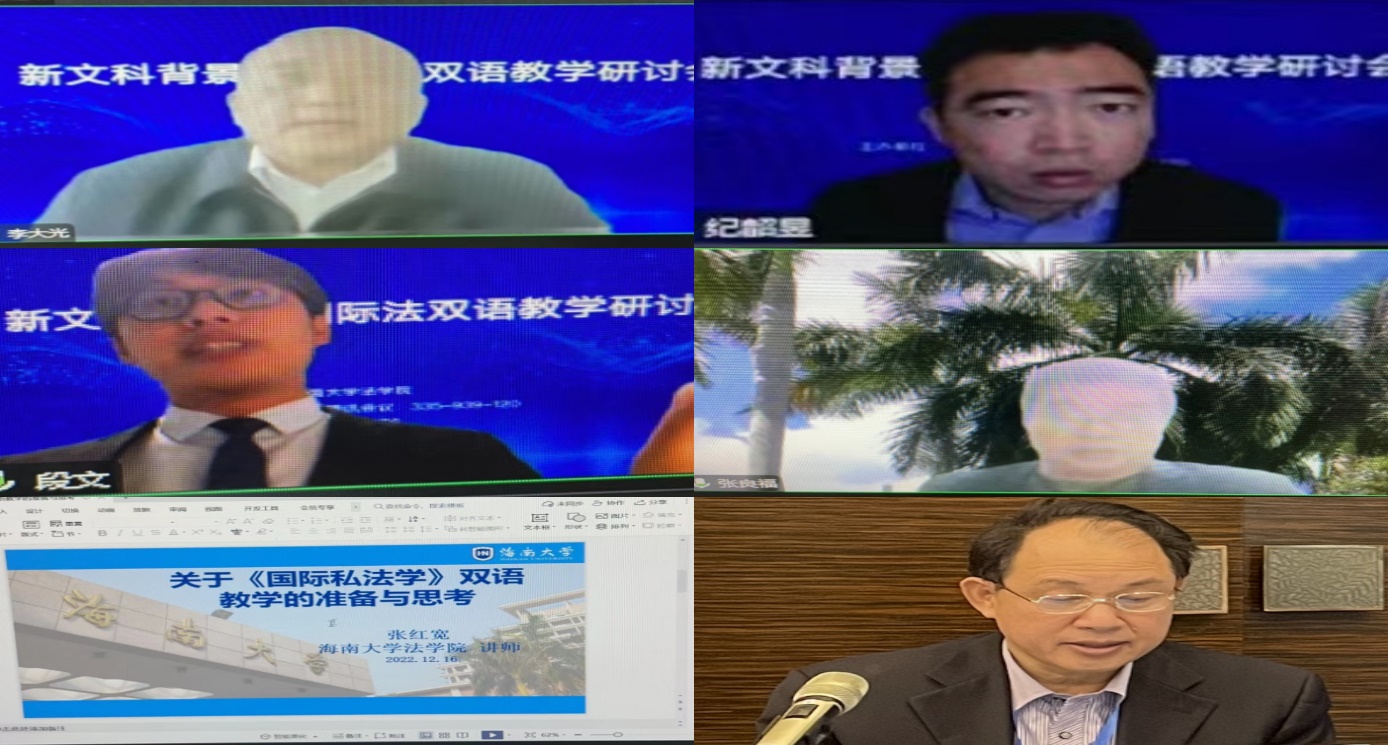 2022年12月16日下午,HAHA体育(纪检监察公司)成功举办了“新文科背景下国际法双语教学研讨会”,本次会议分为主旨演讲、国际法双语教学改革与发展、国际法双语教学与模拟法庭等三个单元,分别由HAHA体育副经理邓和军教授、HAHA体育国际法教研室主任张丽娜教授、HAHA体育李大光教授主持。来自校内外专家学者等20余人参加了此次会议。