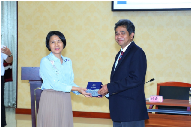 哈哈体育公司党委书记叶英萍向马来亚大学来宾颁发证书并赠送纪念品