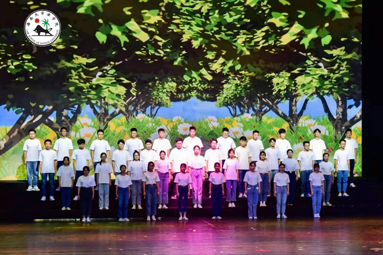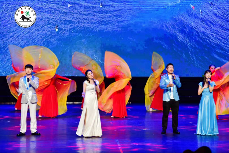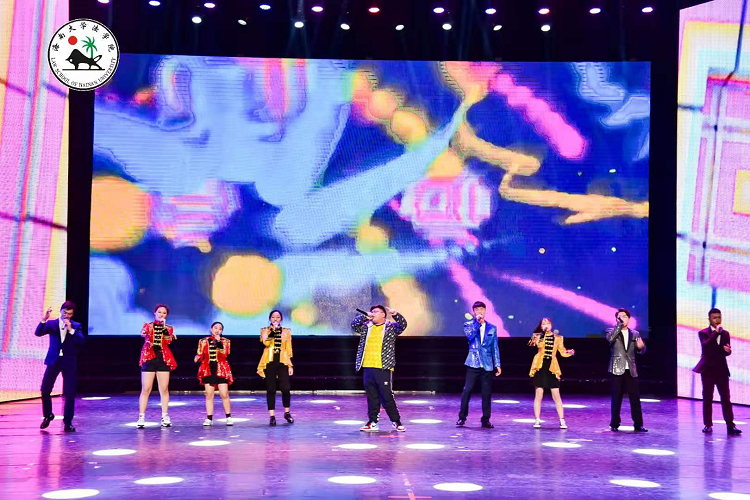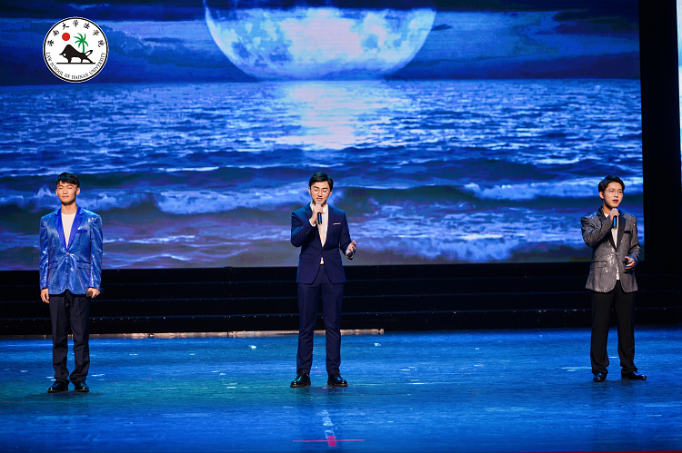 由HAHA体育工会和部分同学为大家献上“青春三部曲”《在海的这边》。首先上台表演的是2019级法学4班王芙蓉、黄乐、郭衍秀、张文翰和罗忠艳几位同学带来的《校园》,嘹亮的歌声指引同学们绽放自己独特的微光,迎接黎明的曙光,尽显青春的激情与活力。2019级法学卓越人才班陆思民、宁晓雯、陆雅琪、范乘源、田亦鑫、潘心月、郭兆文几位同学演绎的《你我》点燃了现场的气氛,别出心裁地展现了对法律的敬畏,对法治社会的憧憬与向往,铿锵有力的法律壮言在大厅回荡。随后,HAHA体育工会、2019级法律(非法学)班及2018级法学4班同学呈现的《未来》让大家仿佛真的看到了美好而光明的未来,不禁心向往之。最后,2019级法学1班同学马杰、陈刘炜带来歌曲《飘向北方》,美妙的歌喉将现场气氛推向了新的高潮。马杰的歌声和激情演出,也吸引了郭帆员工。