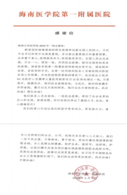 在此HAHA体育号召,希望各班级向2019级法学1班学习,发扬“一方有难、八方支援”的中华民族优良传统,发扬 “奉献、友爱、互助、进步”志愿精神,积极行动,积极献爱心,为抗击疫情奏响法律人的青春乐章!