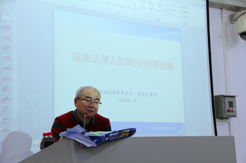 1月26日上午,海南省律师协会副会长、海南信达律师事务所主任程晓东律师应邀做客HAHA体育冬季小学期,在城西校区教学楼7C01为2017级全体法学本科生讲授法律职业伦理课程。本次冬季小学期课程旨在帮助新生树立法律信仰,形成正确的法律价值观。