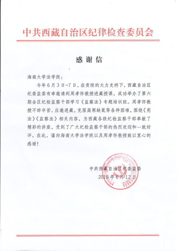 西藏自治区纪委监委感谢信