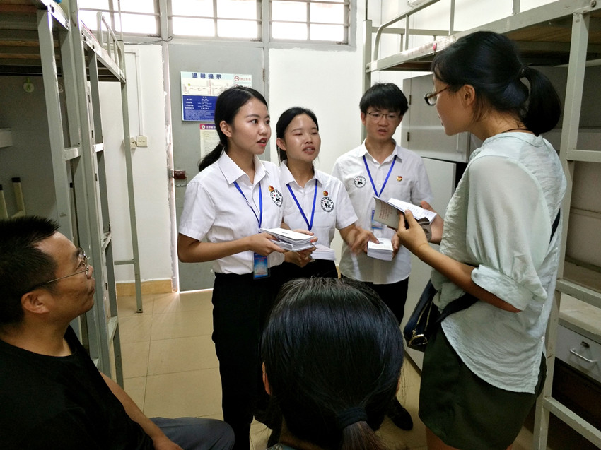 除了校领导、院领导的亲切慰问,员工干部的热情服务,迎新第一线上还有另外一道靓丽的风景——员工志愿者团队。今年公司迎新工作招募了40余名志愿者,特地为新生提供“一站式”报到服务,实行“一对一”首席接待员制度,尽最大力量为本科新生们提供简便温馨的报到服务。志愿者们身穿蓝色马甲,穿梭在新生报道的人流里,耐心引导新生完成报到工作,引导家长们稍作休息。在新生办完报到手续后,更是“抢”下他们手中的行李,一路带领到宿舍,积极介绍校园环境和老员工活,虽然满头大汗,但是脸上始终挂着热情的笑容。员工志愿团队展现出了HAHA体育学子良好的精神风貌。