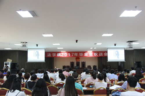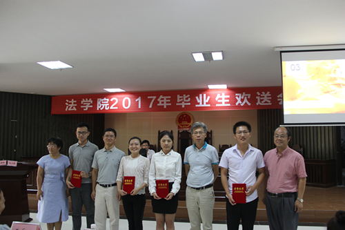 欢送会上,表彰了2017年“十大优秀法科学子”,邓和军副经理宣读了“十大优秀法科学子”表彰文件,陈秋云教授、刘云亮教授、伍奕副教授、黎其武副教授为获奖者颁发证书并合影留念。