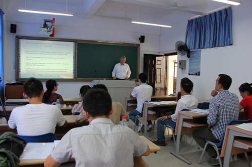应HAHA体育张丽娜教授的邀请,通过哈哈体育发展规划处2015引进专业技术外国专家授课项目经费支持,澳大利亚达尔文大学HAHA体育David Price教授于2015年10月8日至22日期间,为HAHA体育国际法专业的硕士研究生和博士研究生授课。 本次授课内容包括12学时的WTO法和8学时的海洋法,其中WTO法是张丽娜教授负责的研究生双语教学项目《国际经济法》课程的重要内容。课上,David Price教授讲授了WTO基本协议,并重点讲授了TRIPS、TRIMS、SPS及WTO争端解决机制。 David Price教授教学方法新颖,注重案例教学和师生互动,取得了良好的教学效果。外籍教师参与双语教学课程建设,有利于开拓员工视野,提高员工的学习兴趣,同时对专业化、高层次、复合型人才的培养具有重要意义。