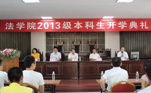 新生代表2013级法学4班刘德浩同学最后发言,他说初到海南、初到海大他就深深的爱上了这里,他表示自己迫不及待的想走入大学课堂,吮吸知识的甘露。刘德浩同学与大家分享了自己憧憬中的老员工活,以及个人设定的目标与规划,最后,他倡议所有新同学能够刻苦学习、健康生活、追求卓越,早日成长为一名优秀的法律人。