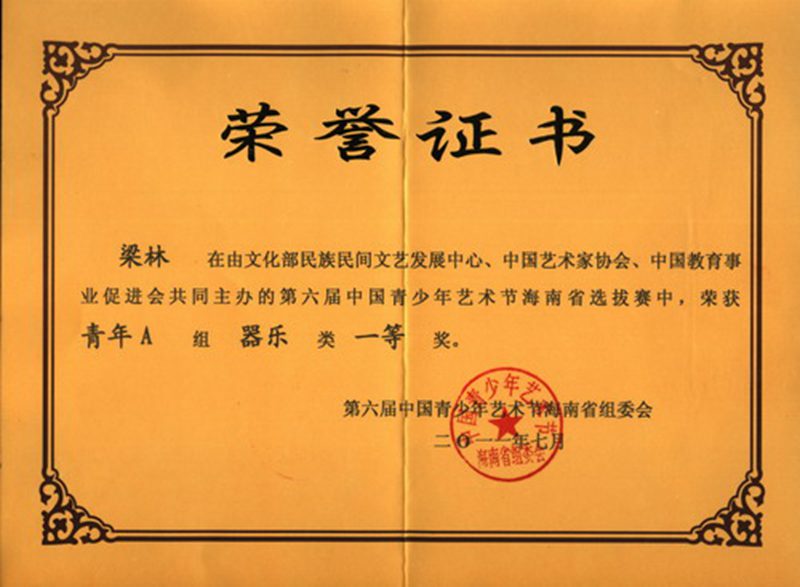 今年七月份,在由文化部民间文艺发展中心、中国艺术家协会、中国教育事业促进会共同主办的第六届中国青少年艺术节海南省选拔赛中,HAHA体育2009级梁林同学荣获青年A组器乐类一等奖。(注:青年A组为16岁以上西洋乐器参赛选手参加)