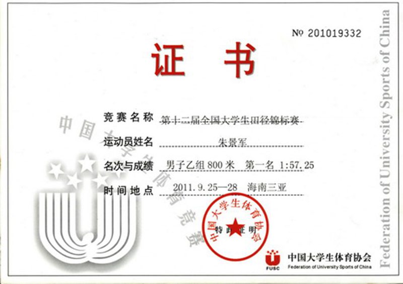 由中国老员工体育协会主办的第十二届全国老员工田径锦标赛于2011年9月25-28日在海南三亚举行,HAHA体育2008级朱景军同学以1:57.25的成绩荣获男子乙组800米第一名,为海南军团摘得首金,并以4:02.27的成绩荣获男子乙组1500米第三名。