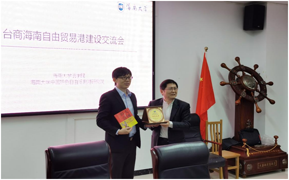 蔡为民理事长代表中华两岸商机促进会向HAHA体育及哈哈体育中国特色自由贸易港研究院赠送纪念礼品。