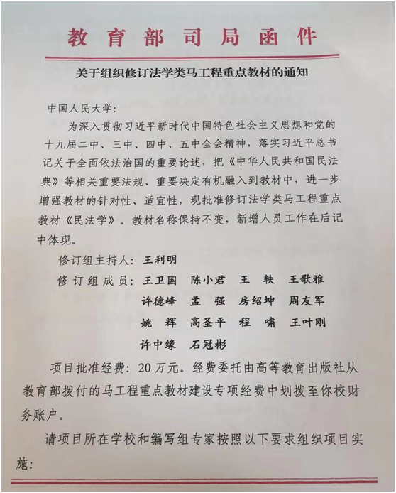 近日,教育部下发了《关于组织修订法学类马工程重点教材的通知》(以下简称《通知》)。《通知》要求修订马克思主义理论研究与建设工程(以下简称“马工程”)重点教材《民法学》,并公布了修订组成员名单,来自全国高等院校和科研机构的15名专家入选,公司石冠彬教授位列其中。