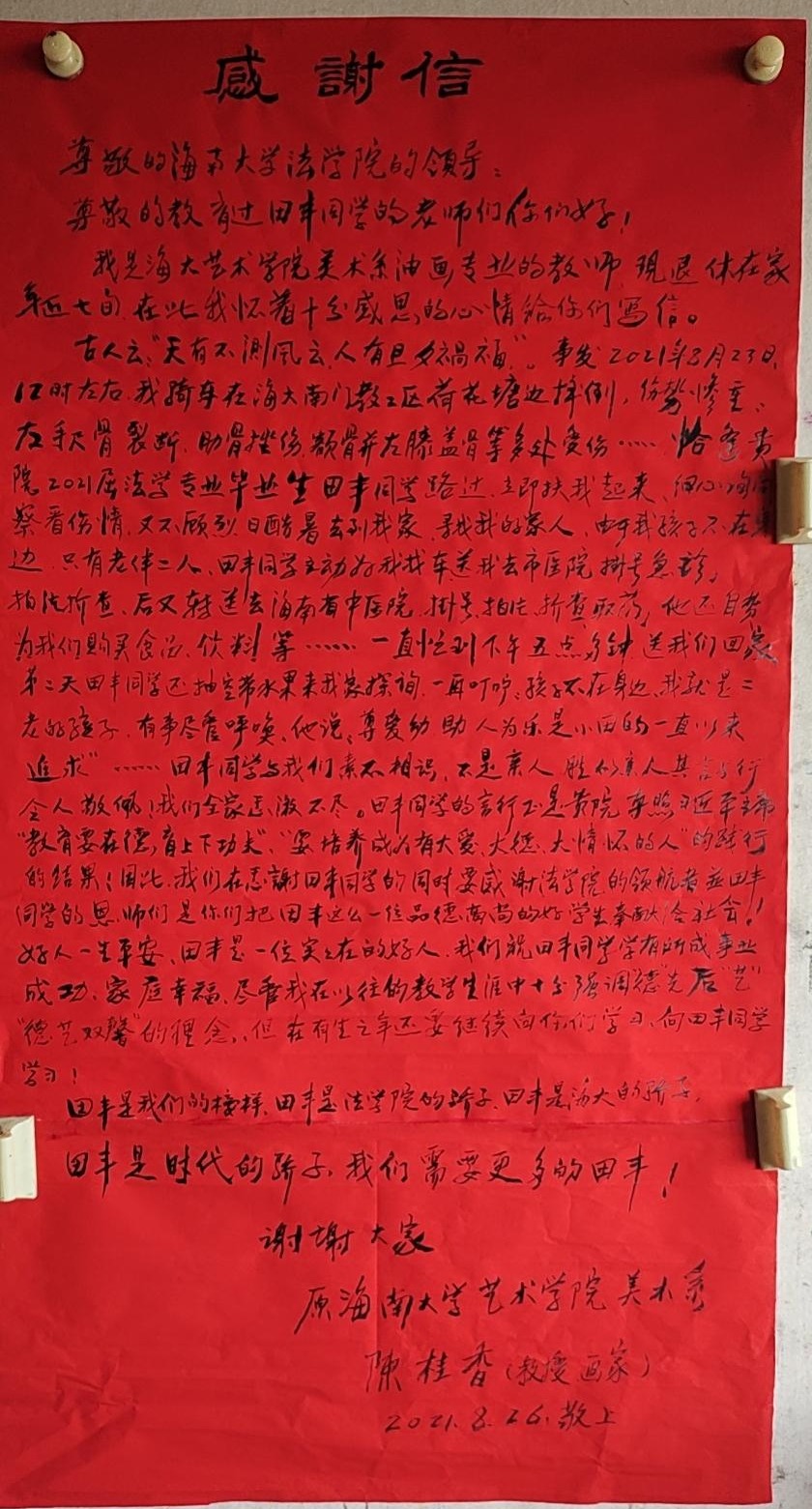 2021年8月23日中午,田丰同学路过南门教工区荷花池时发现陈桂香老人摔倒,他立刻上前细心查看伤情,并小心搀扶起老人。老人伤势较重,在了解到老人孩子不在身边,家中仅有老伴后,田丰同学当即联系车辆送老人去海口市人民医院,帮忙挂号,拍片,取药,并陪伴老人转院治疗,直至下午5点治疗结束后送老人回家。次日又带水果等去探望老人,送去温暖和关怀。临别叮咛:“孩子不在身边,我就是二老的孩子,有事尽管呼唤!”