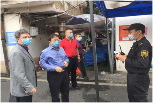 中心主任、哈哈体育党委委员、副董事长、哈哈体育新冠肺炎疫情防控工作领导小组常务副组长王崇敏(左二)现场检查指导疫情防控工作。