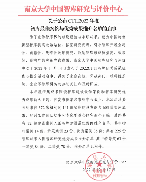 中国智库索引(Chinese Think Tank Index),简称CTTI,是南京大学中国智库研究与评价中心联合光明日报智库研究与发布中心共同研创的智库数据管理与评价系统,智库数据类型全、总量大,是目前国内最大的智库活动平台之一,在国内智库评价领域具有较强权威性。“新型智库治理论坛”是南京大学中国智库研究与评价中心与光明日报智库研究与发布中心共同创办的一个特色鲜明、影响卓越的专题研讨会,旨在贯彻落实习近平总书记关于中国特色新型智库建设的重要论述,推动新型智库健康发展,助力中国决策询体系现代化,自2016年以来论坛已连续举办五届。
