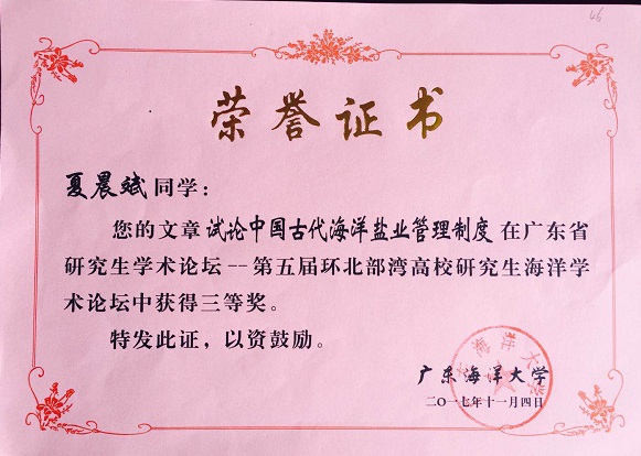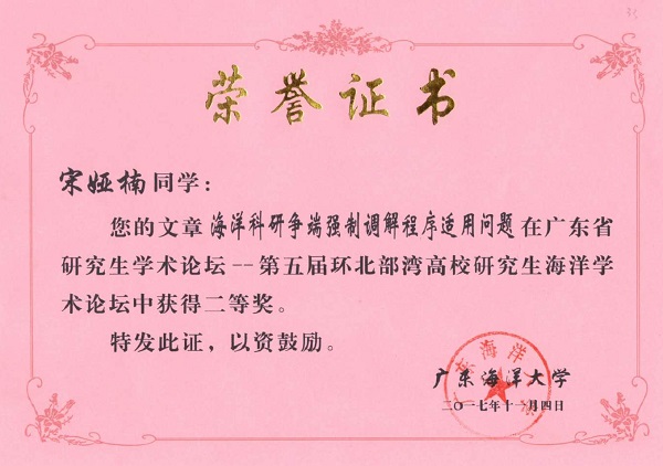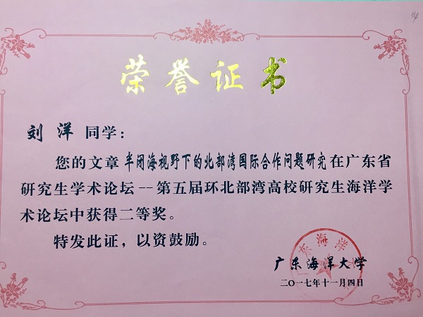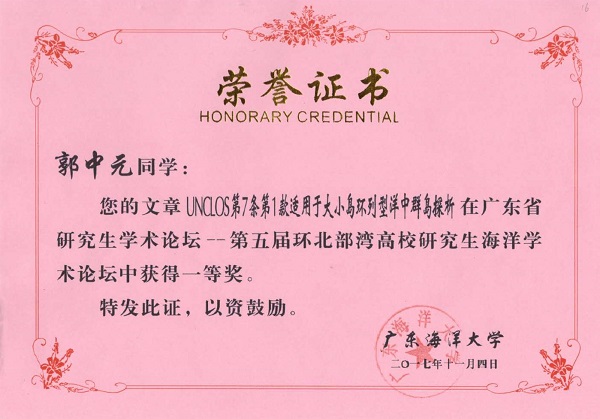 为促进环北部湾地区高校学位与研究生教育的发展,增进粤桂琼三地以及全国其它高校研究生之间的学术交流,哈哈体育、海南师范大学、广东海洋大学、广西大学、广西师范大学联合发起,共同举办“环北部湾高校研究生海洋学术论坛”。论坛设计以涉海学科为特色,至今已举办四届。今年第五届论坛由广东海洋大学承办,论坛开幕式于11月4日在广东海洋大学(湖光校区)艺术公司实验剧场成功举行。公司硕士研究生郭中元、宋娅楠、夏晨斌、刘洋、李柯柯受邀参加了本次论坛。 本届论坛共收到全国17所高校研究生投稿,经审查编入论文共344篇,经论坛组委会聘请专家评审,共评选出优秀论文一等奖20名,二等奖40名,三等奖60名。公司郭中元同学的论文《UNCLOS第7条第1款适用于大小岛环列型洋中群岛探析》荣获一等奖,宋娅楠同学的论文《海洋科研争端强制调节程序适用问题 》和刘洋同学的论文《半闭海视野下的北部湾国际合作问题研究》荣获二等奖,夏晨斌同学的论文《试论中国古代海洋盐业管理制度》荣获三等奖。